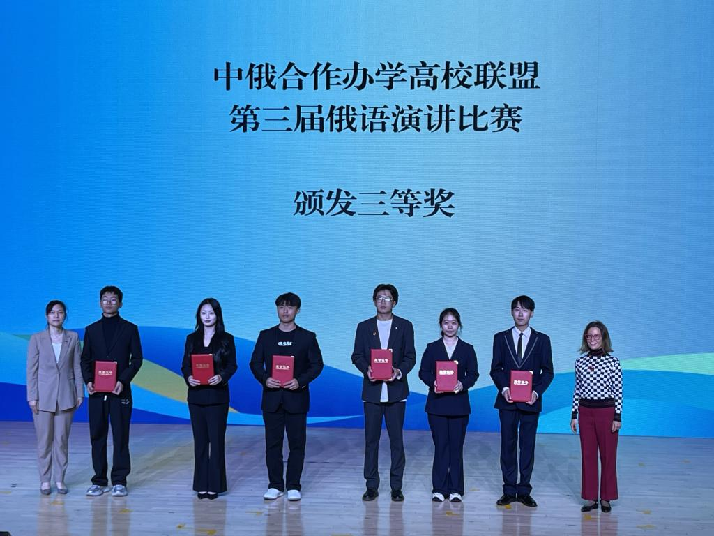 此次比赛是我校中俄合作办学机构的学生首次参加的赛事,极具挑战性。我校派出的4名选手分别是船海(中俄)1231班蔡荣捷、李可钦、胡耀东,电信(中俄)1231班孟当博。选手们克服层层困难,在比赛中能清晰表达中俄传统文化及抒发中俄友谊情感,以演讲主题鲜明、积极健康、表达完整、俄语发音准确流畅、展现时代精神风采等斩获了奖项。最终,胡耀东、孟当博获得低年级组三等奖,蔡荣捷、李可钦获得高年级组三等奖。