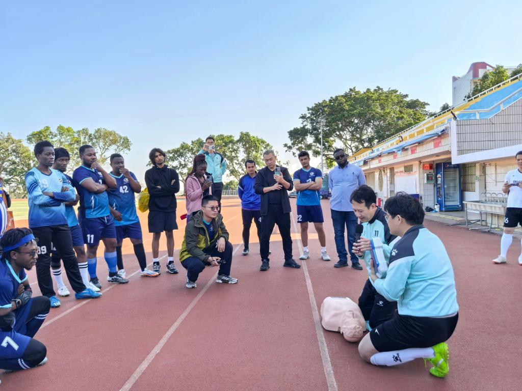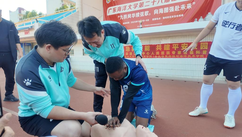 活动伊始,急诊医学科主任、湛江市医院协会门急诊管理委员会主任委员、广东省五一劳动奖章获得者陈粤明教授领衔的医疗队医生借助模拟人等专业教具,结合校内已配备的AED设备,以中英双语为来自多个国家的留学生及中外合作办学学生系统讲解并演示了心肺复苏、创伤包扎等急救技能。医生们注重实操指导,邀请学生代表现场演练,及时纠正动作细节,在互动中强化急救意识与自救互救能力。这一环节不仅提升了学生的安全素养,也展现了中国医疗机构的社会责任感与专业精神,让国际学生亲身感受到中国校园安全建设的人文关怀。